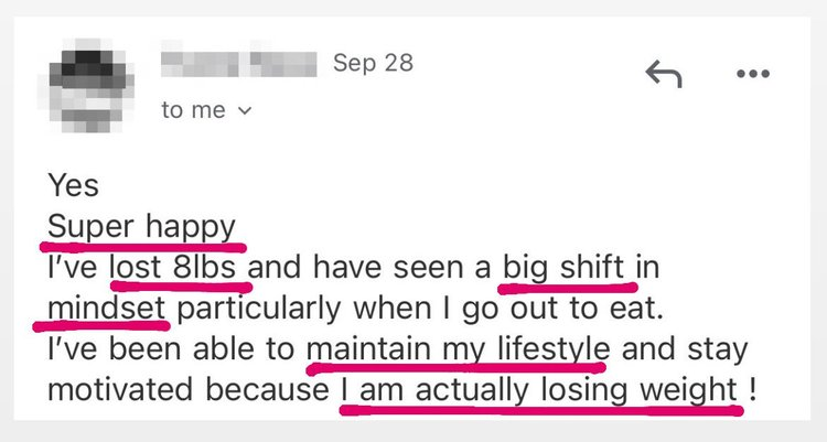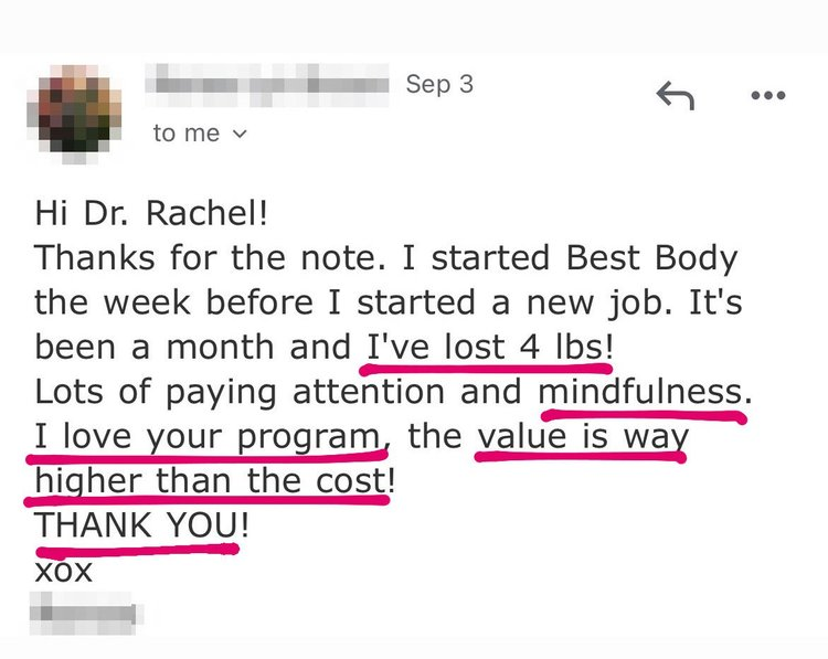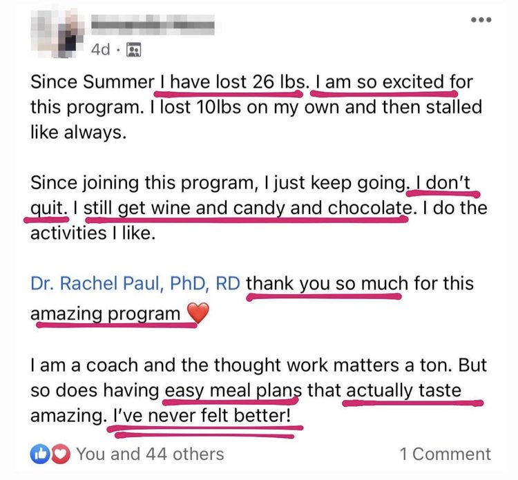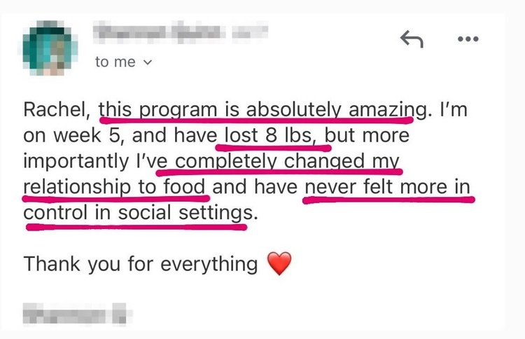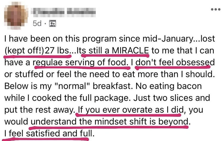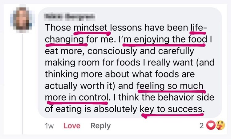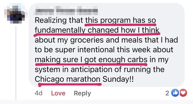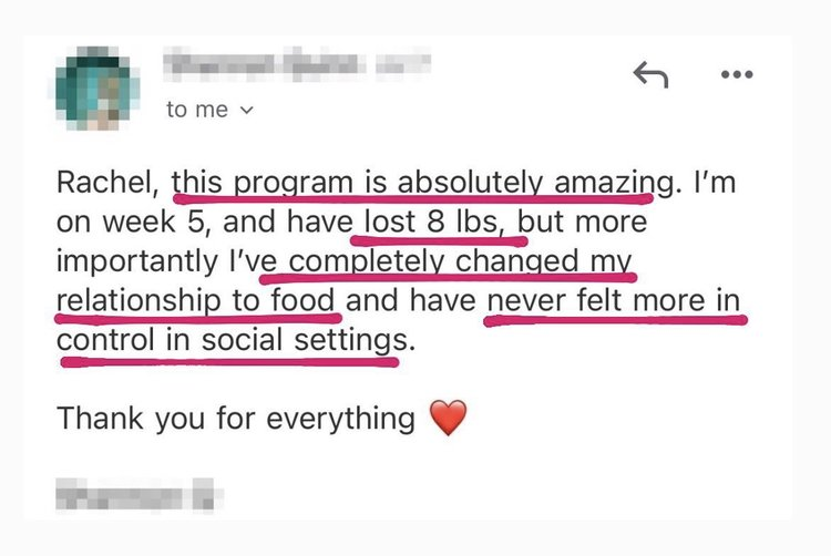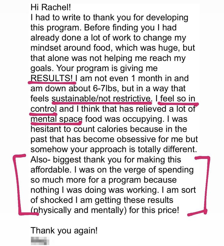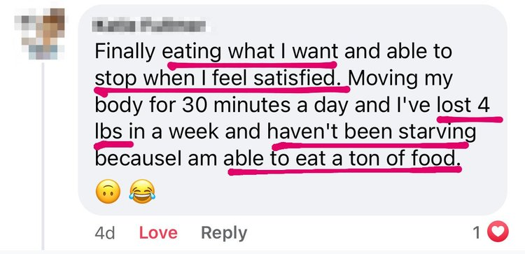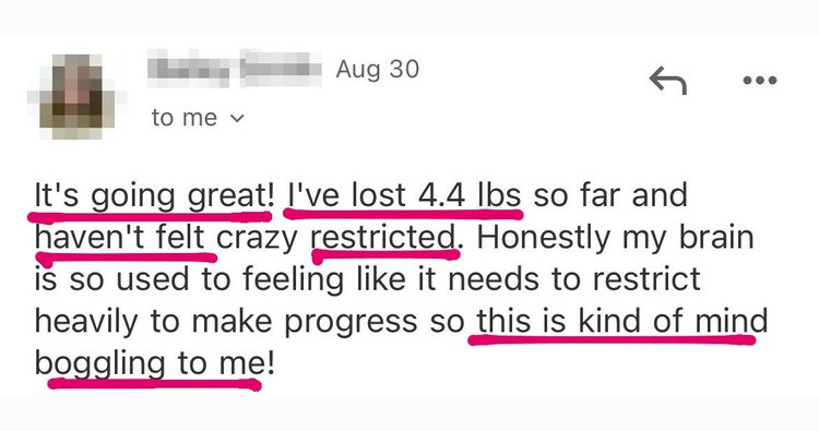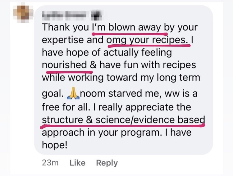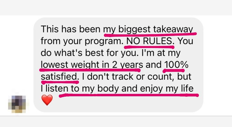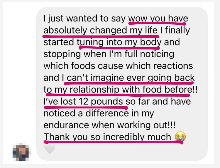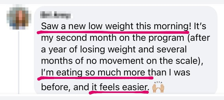 This program is amazing! I’ve lost 28 lbs and 6 sizes. I’ve learned so much about my body, I’ve really attuned to my hunger and fullness cues.