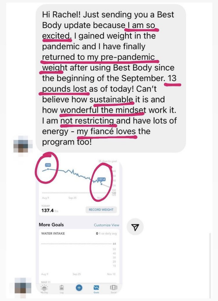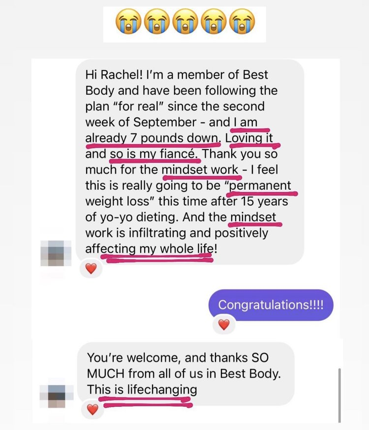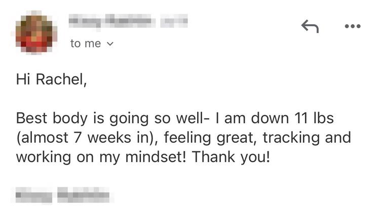 After the first couple weeks of Best Body I started thinking “Wow I am such a happier person now.” It wasn’t because I lost weight, but because I wasn’t starving myself and saw such an improvement in my body and how healthy of a mindset I was having. I am blown away by my ability to become a healthier person and a more loving person to myself.